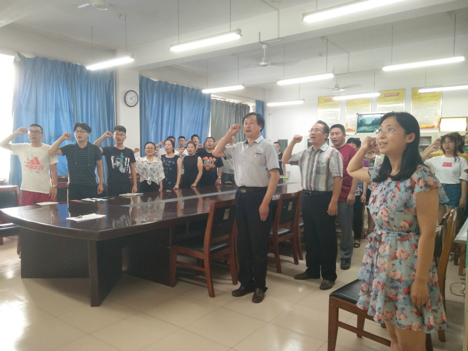 会议伊始,刘培利书记对党员工作进行总结及指导,他指出,作为党员,应具有党员信念,践行党员义务,坚持“四讲四有”、“四个合格”,同时要加强组织领导建设,加强党务工作宣传,切实保证教育实践活动取得实效。随后,全体党员面向鲜艳的党旗,在党组织负责人的带领下,列队整齐,举起右手,在党旗下重温入党誓词。