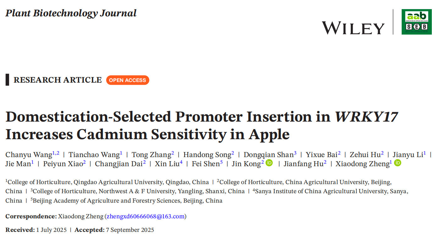 近日,tyc522cc太阳成集团果树生物技术与种质创新团队联合中国农业大学和北京农林科公司生物技术研究所在Plant Biotechnology Journal上发表了题为“Domestication-selected Promoter Insertion in WRKY17 Increases Cadmium Sensitivity in Apple”的研究论文,系统揭示了栽培苹果与野生苹果在镉抗性方面差异的分子机制。该研究指出,转录因子WRKY17启动子区的一个自然变异插入是导致两者抗镉能力差异的关键因素,并深入解析了WRKY17参与镉胁迫应答的新机制。