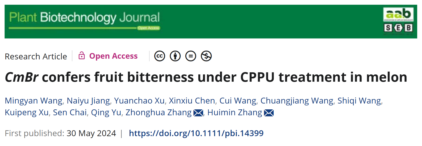 2024年5月30日,太阳成集团tyc522cc张忠华/张慧敏团队在Plant Biotechnology Journal上在线发表了题为“CmBr confers fruit bitterness under CPPU treatment in melon”的研究论文,该研究揭示了CmBr响应CPPU导致甜瓜果实变苦的分子机制,并创制出甜瓜果实不苦的材料,为解决生产上果实容易出现苦味的产业问题提供了理论基础和育种材料。