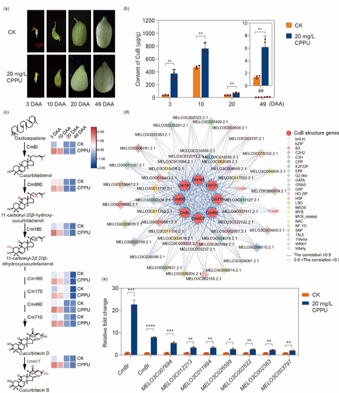 为了进一步探究CmBr响应CPPU导致甜瓜果实变苦的分子机制,该研究通过遗传学和分子生物学实验揭示了CPPU能够诱导上游因子CmRSM1的表达,CmRSM1能够结合Myb结合元件激活CmBr的表达,从而调控下游8个CuB合成基因(CmBi、Cm160、Cm170、Cm180、Cm710、Cm890、Cm490和CmACT)的表达,促进葫芦素B的生物合成,最终导致甜瓜果实出现苦味。