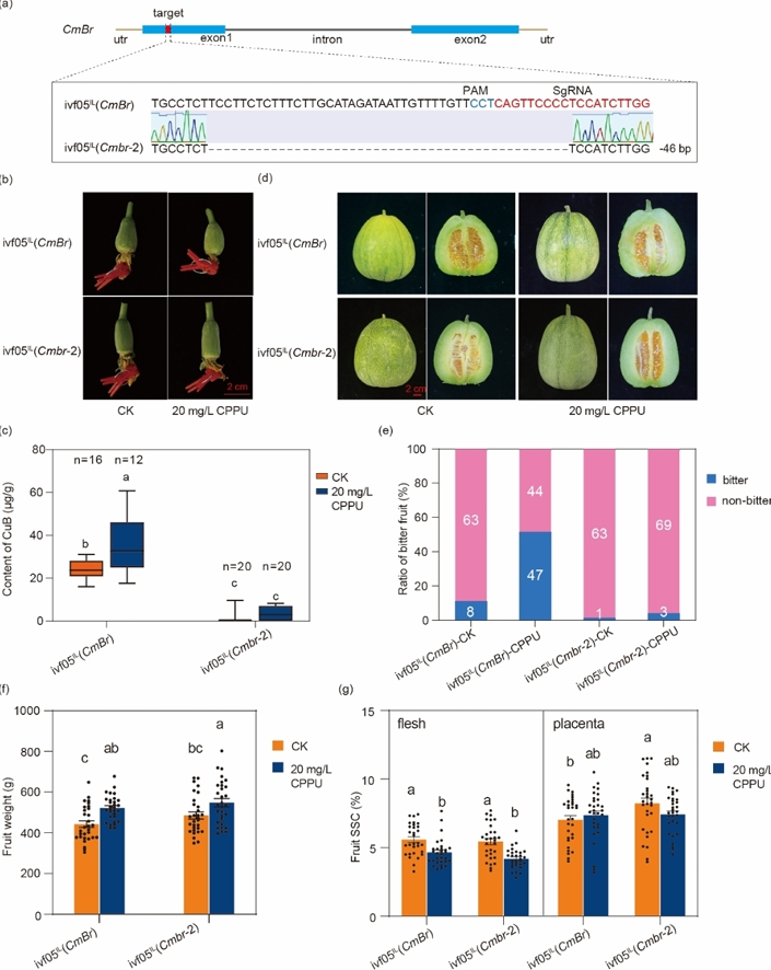 该研究通过对CPPU处理后不同时期果实的葫芦素B含量与转录组数据联合分析,构建了CPPU诱导果实中葫芦素B合成的转录因子调控网络,并发现一个bHLH家族转录因子CmBr可能是关键调控因子(图1)。利用CRISPR/Cas9敲除CmBr基因,结合传统的回交育种方法获得了Cmbr近等基因系。测定近等基因系果实3 DAA葫芦素B含量,结果显示,CPPU处理后野生型果实的葫芦素B含量显著增加,而突变体果实的葫芦素B含量没有显著变化,果实仍然不苦。