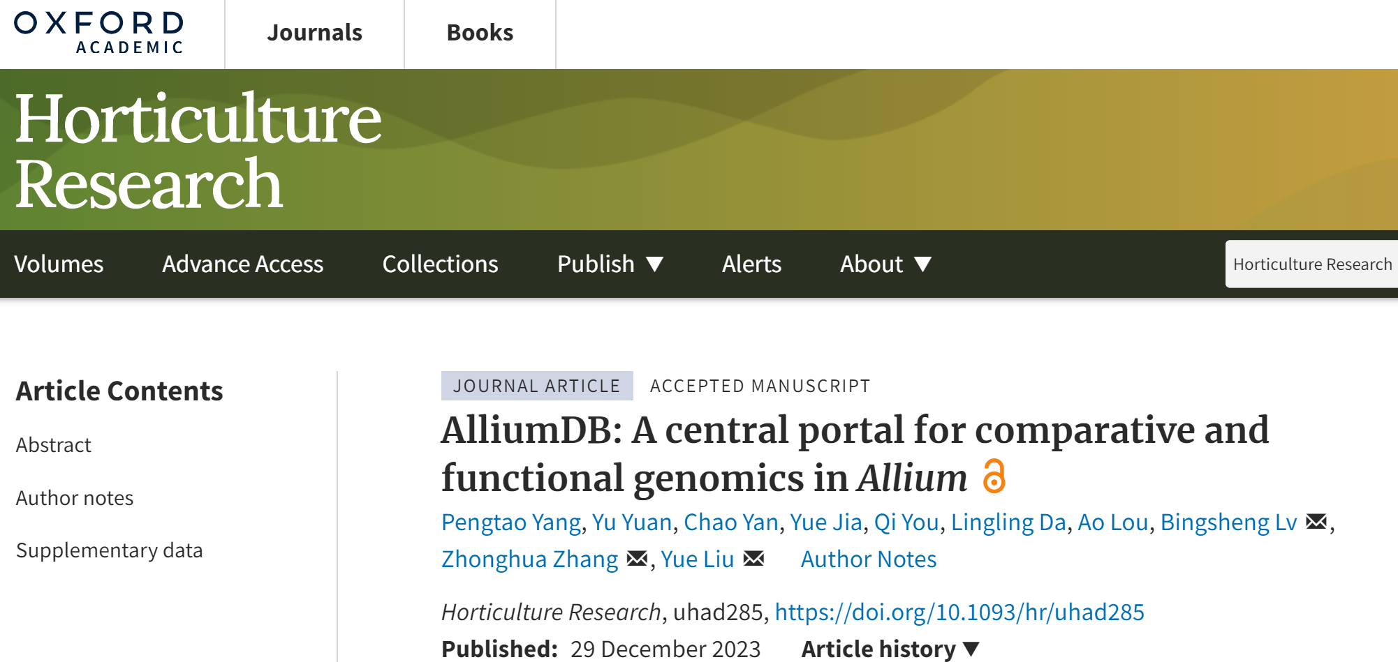 近日,太阳成集团tyc522cc大葱分子设计育种创新团队在国际著名期刊Horticulture Research发表题为 AlliumDB: A central portal for comparative and functional genomics in Allium的研究论文。该研究通过整合葱属多个物种的基因组、转录组、变异组、表型组等数据,构建了一个葱属比较基因组学和功能基因组学数据库,为葱属作物遗传育种研究提供了重要的数据资源和分析平台。