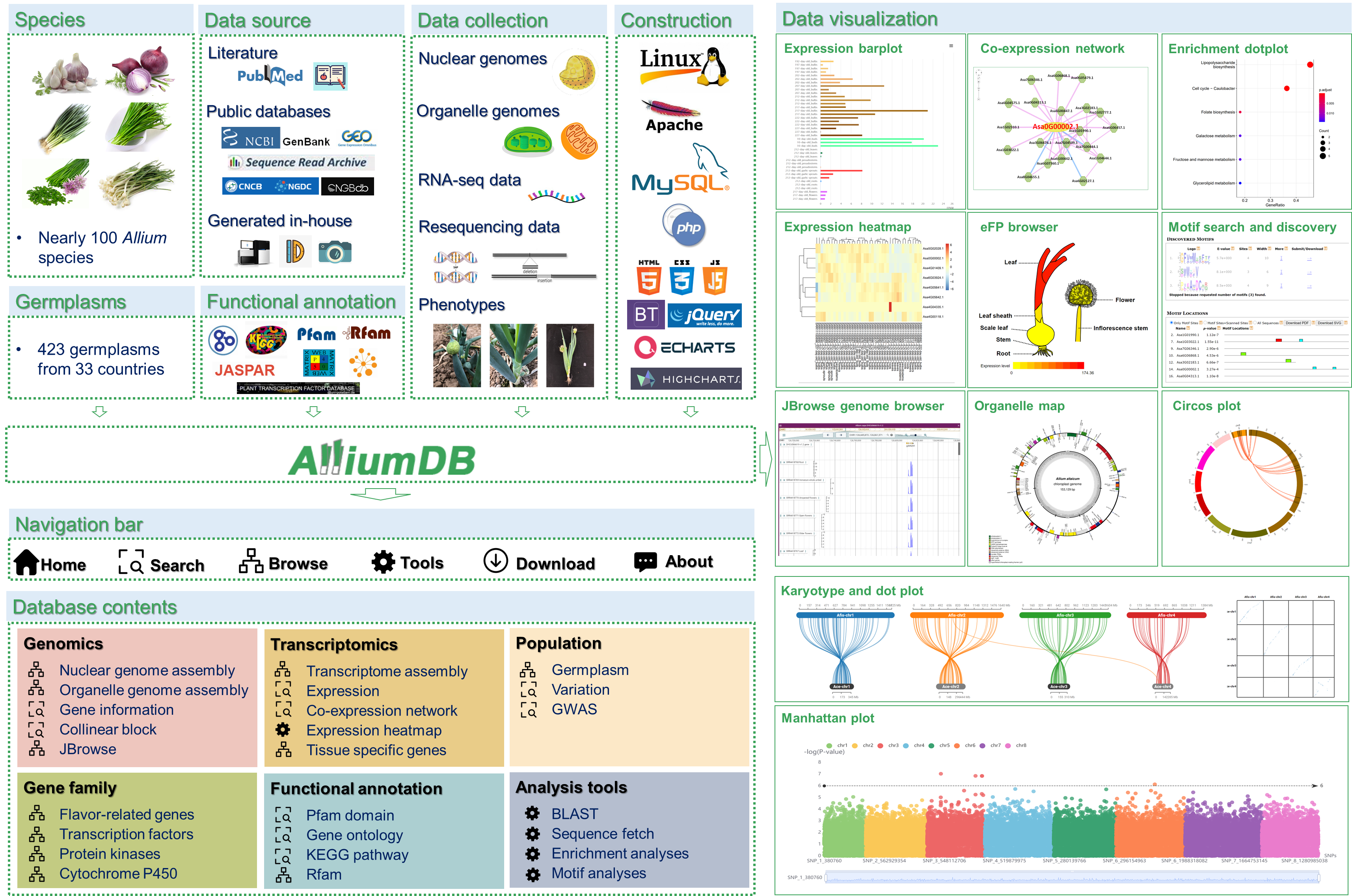 葱属(Allium L.)是单子叶植物中最大的属之一,包括许多经济上重要的蔬菜如洋葱、大蒜、葱和韭菜等。葱属植物拥有相对较大的基因组(10–30 Gb),限制了全基因组水平上对农艺性状的解析,虽然近年来基因组、变异组、转录组、蛋白组等数据快速积累,但目前尚未有一个全面、系统的葱属多组学数据整合和分析平台,严重阻碍了功能基因的挖掘和分子育种进程。