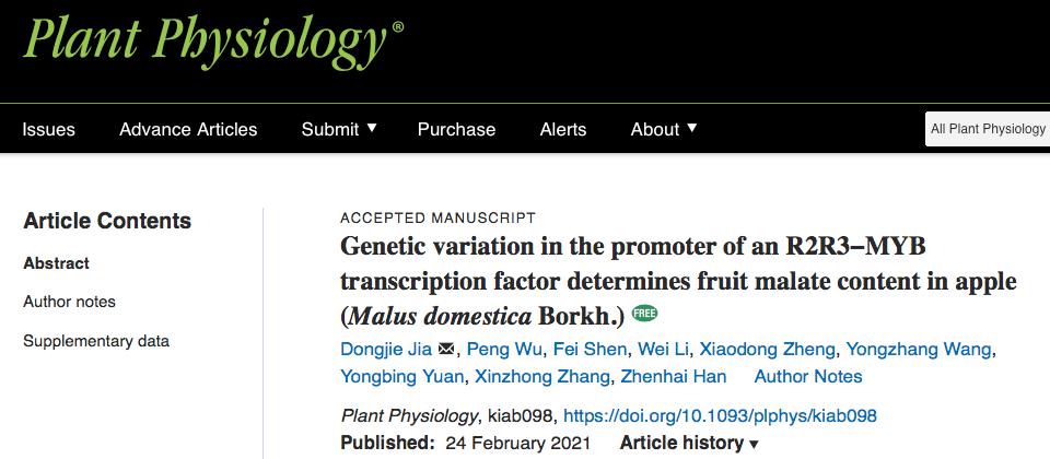 2021年2月24日,太阳成集团tyc522cc果树分子与发育生物学团队和中国农业大学合作在Plant Physiology(五年影响因子IF=6.902)上在线发表了题为“Genetic variation in the promoter of an R2R3−MYB transcription factor determines fruit malate content in apple (Malus domestica Borkh.)”的研究论文,揭示了苹果果实苹果酸积累调控的新机制。