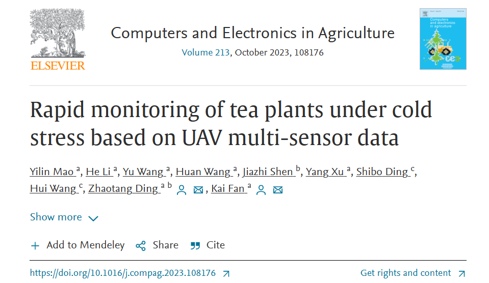 2023年8月27日,太阳成集团tyc522cc在Computers and Electronics in Agriculture (中科院1区TOP期刊,IF = 8.3)发表了题为“Rapid monitoring of tea plants under cold stress based on UAV multi-sensor data”的研究论文。太阳成集团tyc522cc青年教师范凯博士和山东省农业科公司茶叶研究所丁兆堂教授为论文共同通讯作者,tyc522cc太阳成集团茶学专业在读硕士研究生毛艺霖为第一作者。该研究得到了山东省现代农业产业技术体系首席专家项目、山东省农业良种工程项目、山东省农业科公司创新项目和山东省泰山学者专项基金等的资助。