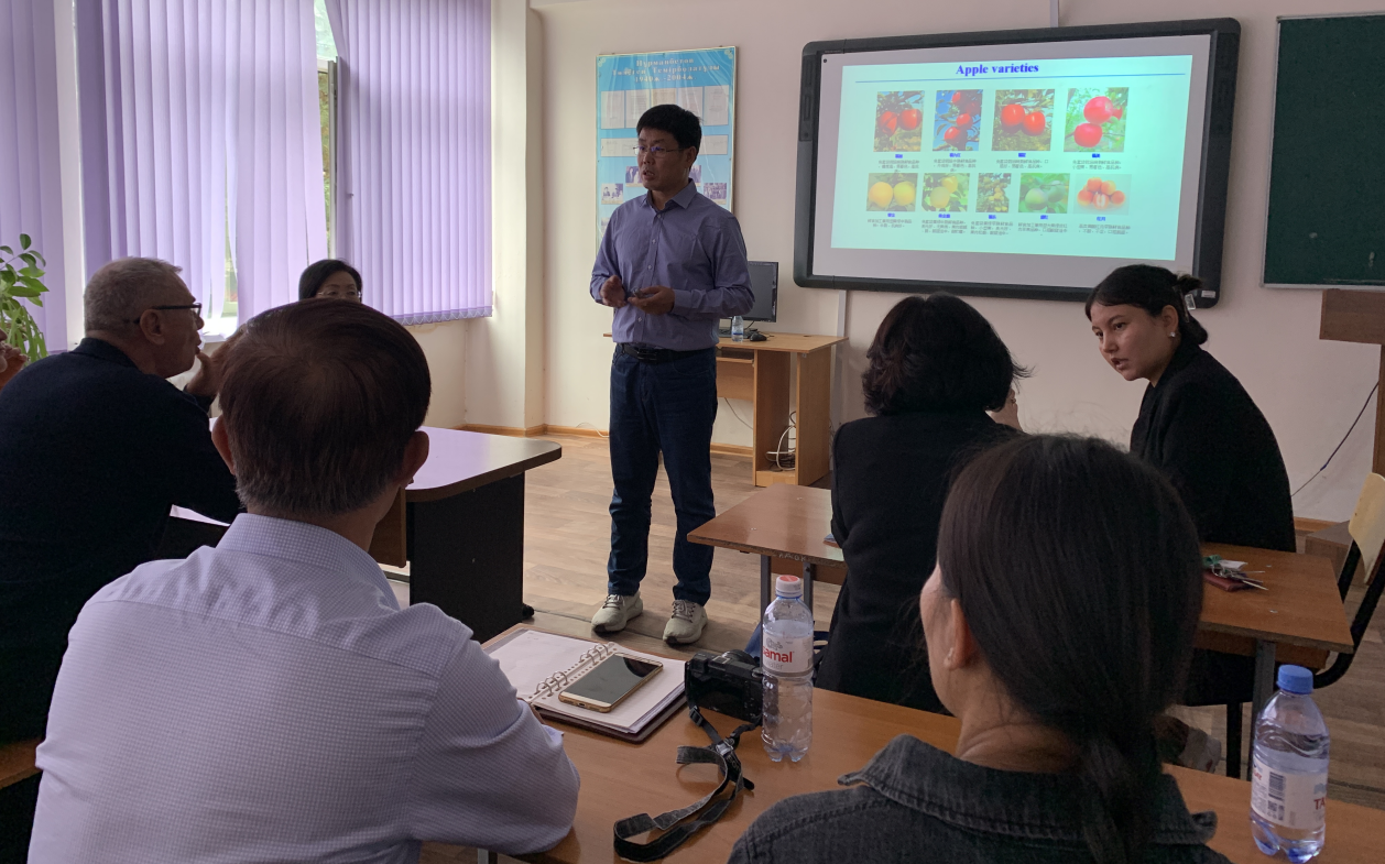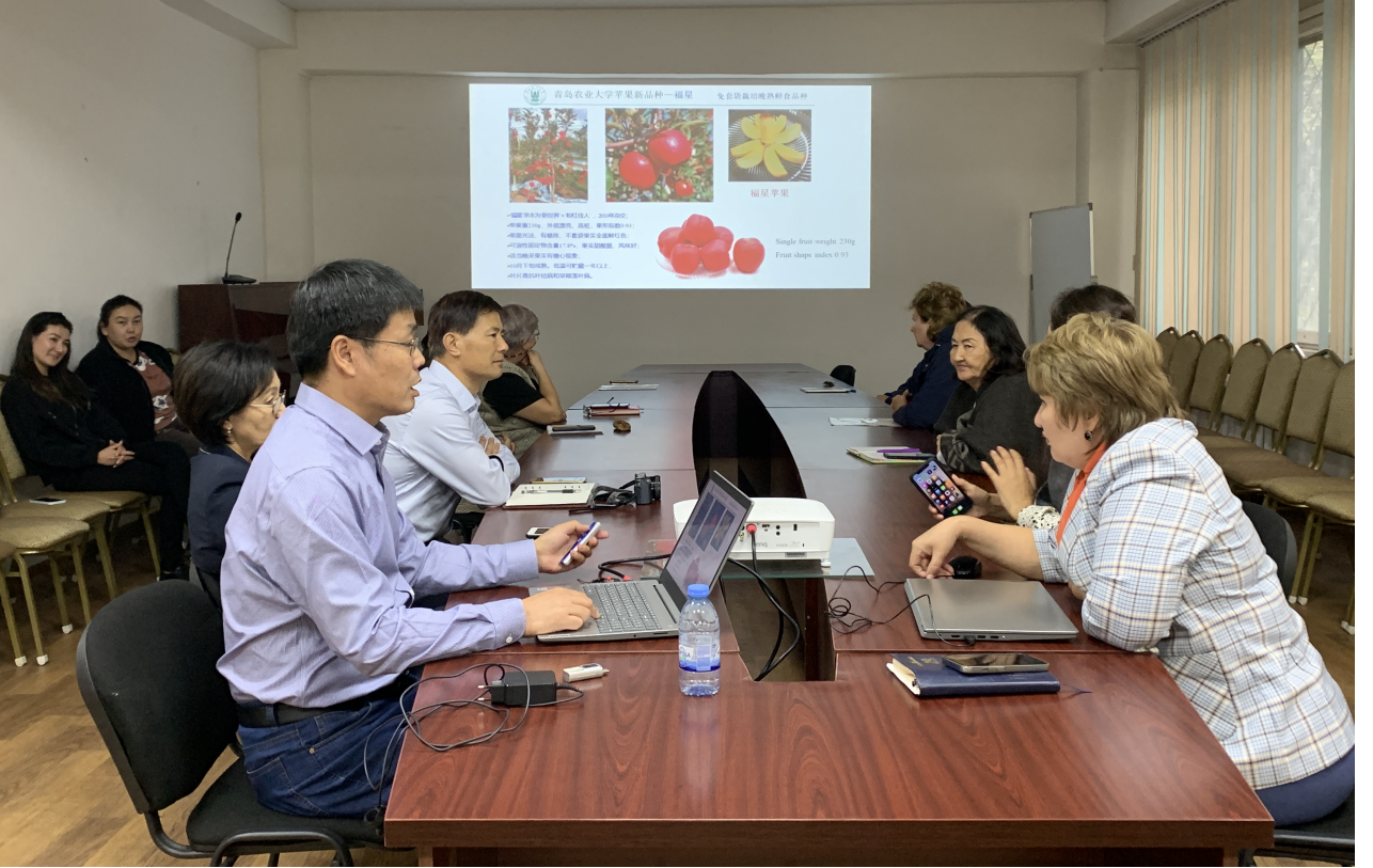 在访问哈萨克斯坦期间,会见了哈萨克斯坦国立农业大学农业生物学公司经理阿比尔达耶夫·叶尔詹(Abildayev Yerzhan)研究员、哈萨克斯坦农科院院士、哈萨克斯坦国立农业大学农业生物学公司园艺系凯罗娃·古尔沙利亚(Kairova Gulshariya)教授、园艺系主任、教研室主任、专业教师以及哈萨克斯坦农科院果蔬所所长、科研人员。围绕苹果野生资源评价与利用以及苹果抗病育种技术进行了交流,讨论了未来的国际合作。张玉刚教授作了“tyc522cc太阳成集团苹果抗病杂交育种研究进展”的报告,并参观了该校与日本合作建立的生物技术研究中心实验室、公司实验站和苹果园。