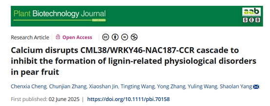 近日,太阳成集团tyc522cc杨绍兰/程晨霞团队在Plant Biotechnology Journal杂志在线发表了题为“Calcium disrupts CML38/WRKY46-NAC187-CCR cascade to inhibit the formation of lignin-related physiological disorders in pear fruit”的研究论文。