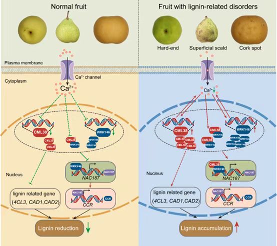 果实的生理病害表现为外部和/或内部组织损伤,通常以褐变、硬化或木栓化等症状为特征。其中,果顶硬化、虎皮病和木栓斑点病是梨果中普遍存在的生理病害,对果实质量和果农收入有重大影响。这些病害与受影响组织中木质素沉积增加有关。虽然已知缺钙会加剧木质素相关的生理,但钙调节这些生理病害的精细调控机制仍不清楚。该研究以果顶硬化症为研究模型,探索钙在调控木质素相关生理病害中的调控网络,证明梨果实中木质素相关生理病害的发生是由 CML38/ WRKY46-NAC187-CCR 调控模块介导的,钙信号通过破坏CML38/WRKY46-NAC187-CCR 级联反应抑制木质素的合成。