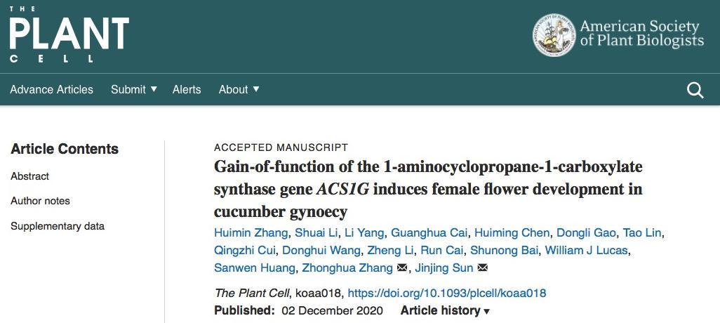 近日,太阳成集团tyc522cc张忠华教授和中国农业科公司蔬菜花卉研究所孙进京合作,联合中国农业科公司深圳农业基因组研究所首次发现黄瓜中全雌基因(Female)是获得新功能的基因ACS1G,并深入研究了其作用机制,提出了黄瓜雌花和雄花多样性发育的分子模型。相关研究内容『Gain-of-function of the 1-aminocyclopropane-1-carboxylate synthase gene ACS1G induces female flower development in cucumber gynoecy』于12月2日在线发表于《The Plant Cell》上。