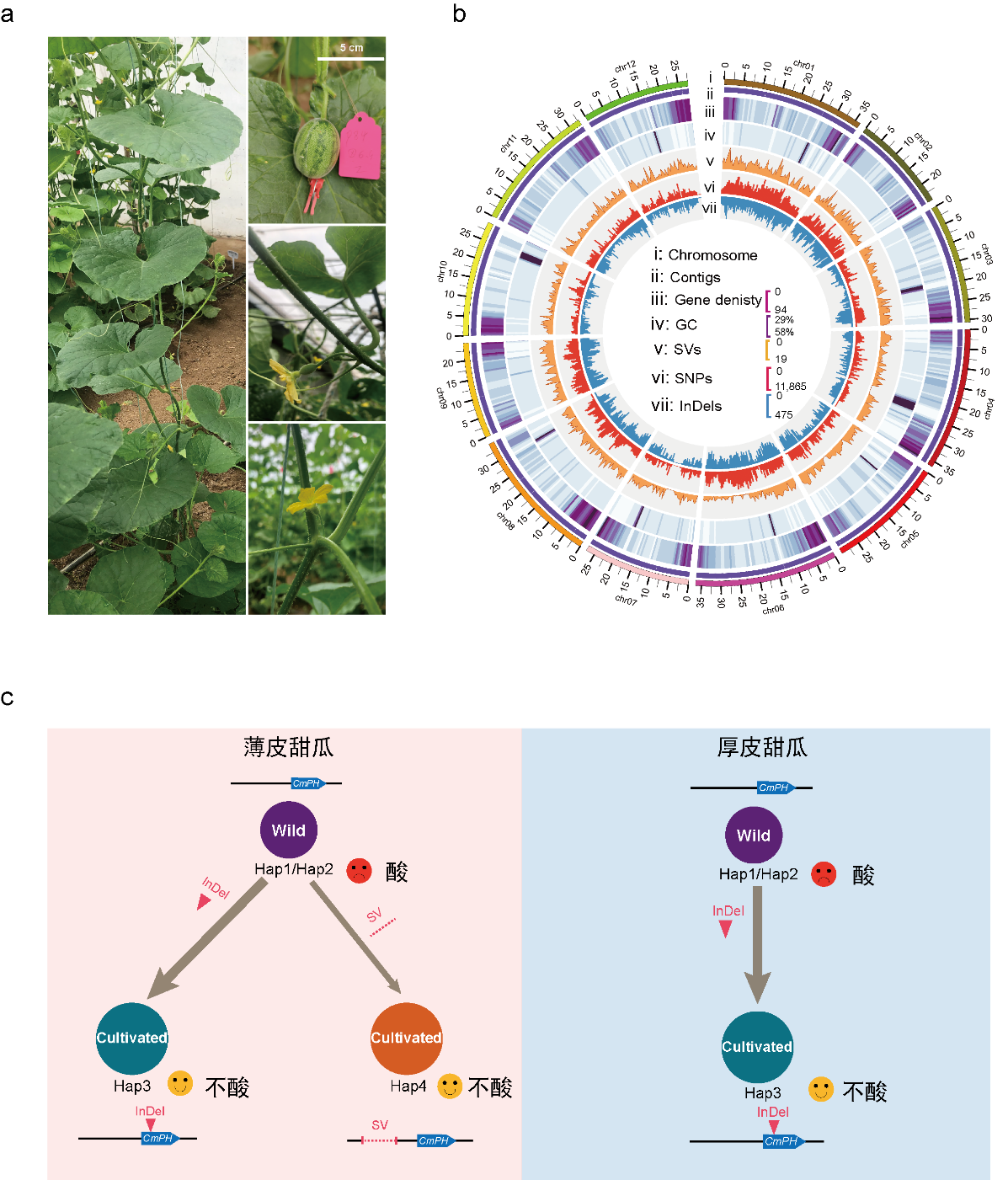近日,tyc522cc太阳成集团张忠华团队在Theoretical and Applied Genetics(中科院1区Top)发表了题为“A wild melon reference genome provides novel insights into the domestication of a key gene responsible for melon fruit acidity”的研究论文。该研究组装了一个高质量代表性野生甜瓜基因组,并构建了甜瓜群体的结构变异(SV)图谱。利用SV图谱鉴定到一系列具有驯化特征及重要性状相关的候选SVs,新发现了薄皮甜瓜中特有调控果实酸味的关键遗传变异,并揭示了甜瓜酸味控制基因的演化路径,为育种中精确调控果实酸味提供了基因靶标。