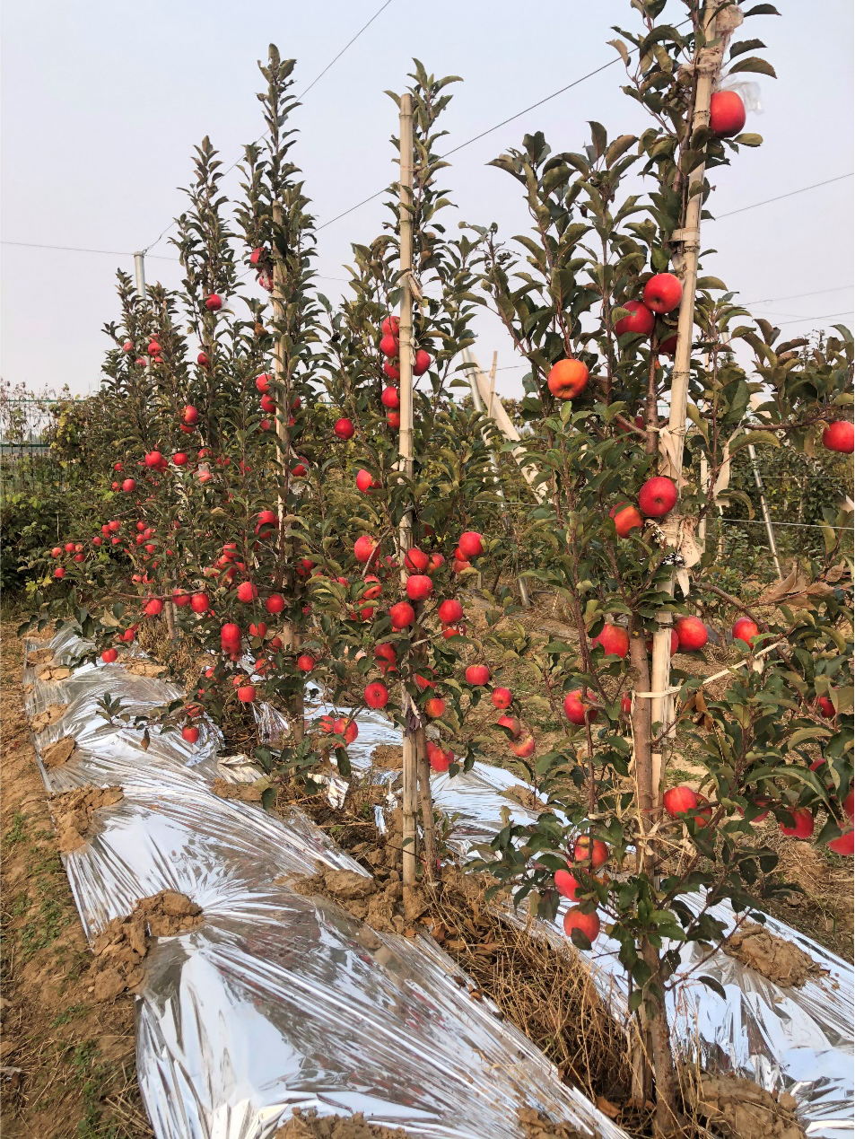 参会人员现场参观了平度市南村镇沙梁新村‘福星’示范基地及其他苹果新品种试验园。在‘福星’基地现场,国家苹果产业技术体系岗位科学家、山东省科技特派员、太阳成集团tyc522cc张玉刚教授介绍了‘福星’选育过程和品种特性,并详细解答了观摩人员的现场提问。沙梁新村王恩忠书记介绍了该村苹果示范基地的建设情况以及从tyc522cc太阳成集团引进的‘福星’、‘福美’、‘福丽’和‘福九红’等苹果新品种在当地的具体表现。该示范园2020年用一根杆矮化自根苗建园,栽植第二年开始挂果,第三年亩产3000斤左右,‘福星’田间表现高抗叶枯病和早期落叶病。