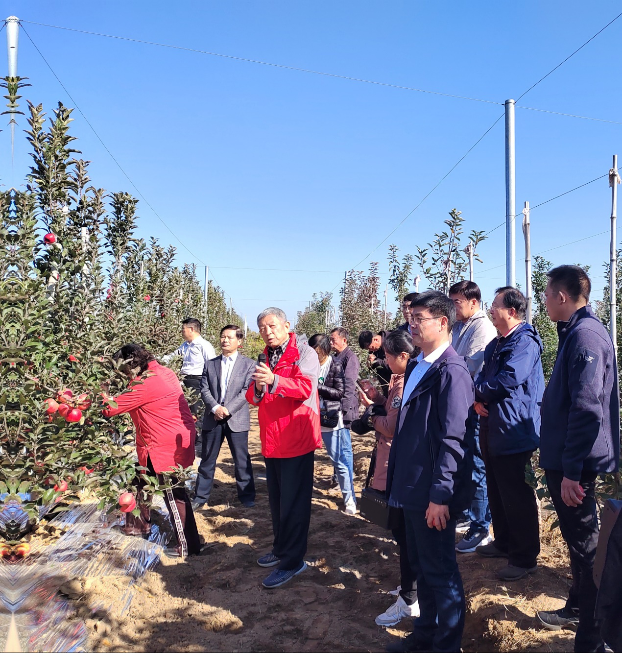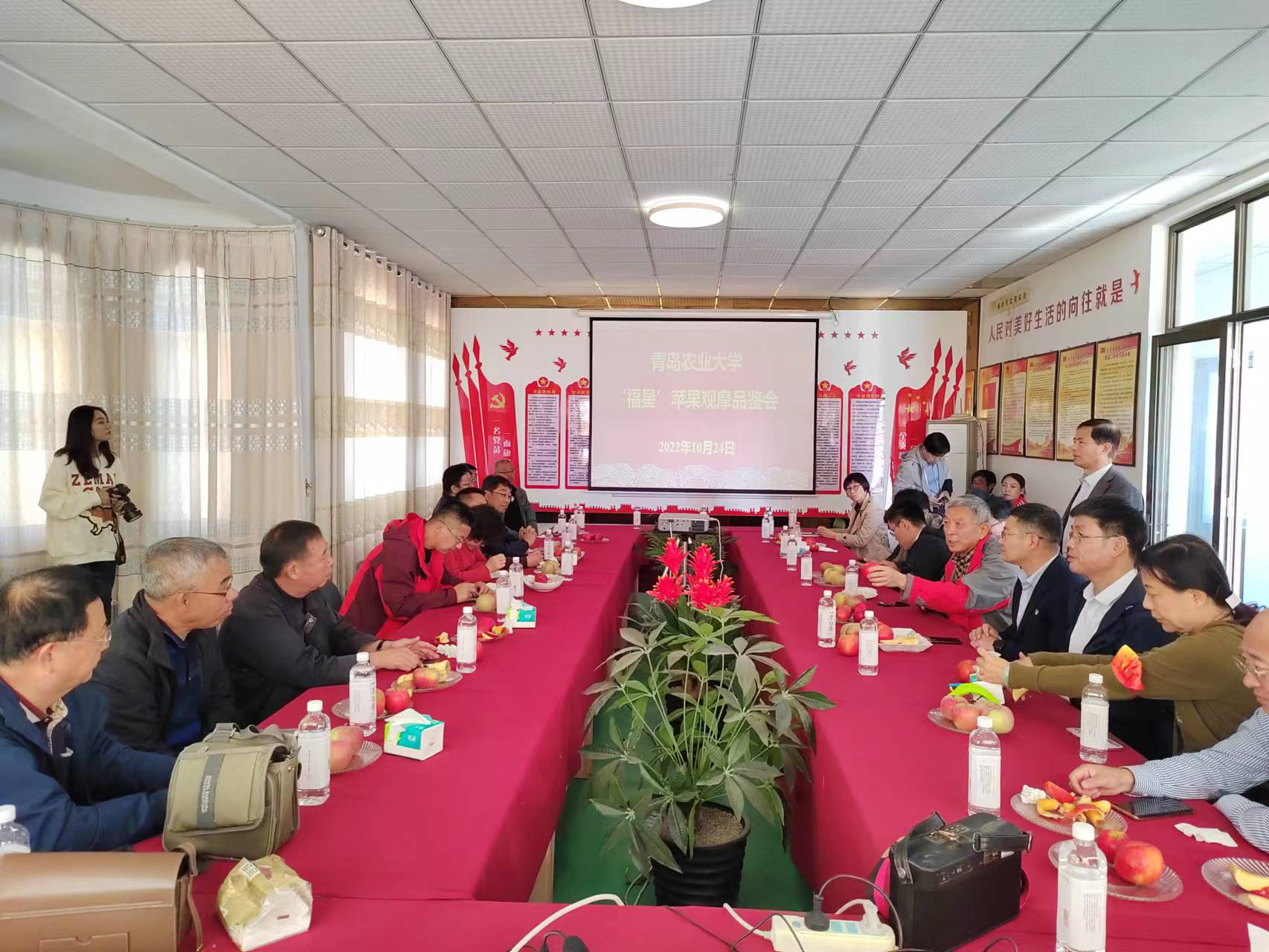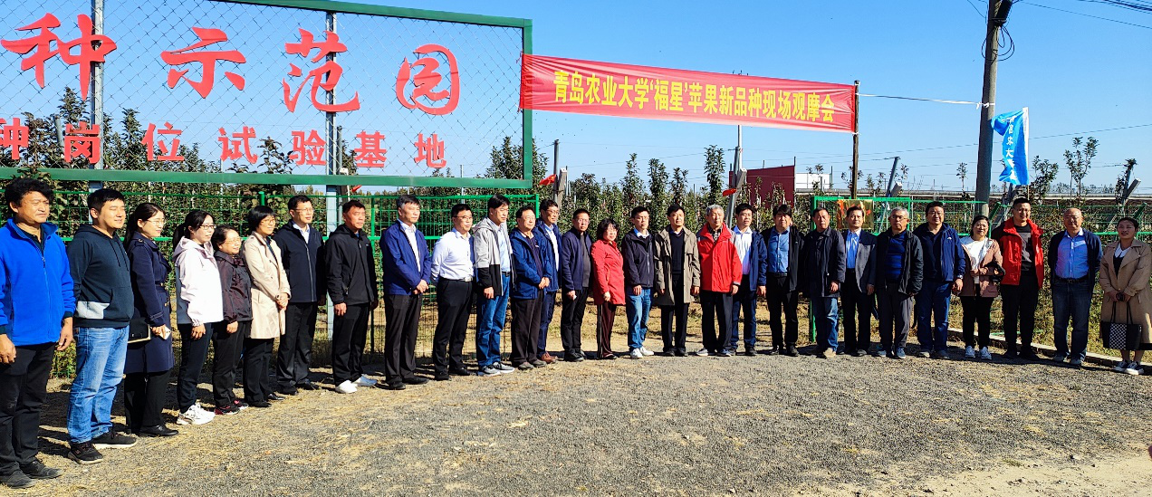 10月24日,tyc522cc太阳成集团在公司苹果育种基地平度市南村镇沙梁新村召开晚熟苹果品种‘福星’现场观摩品鉴会。国家苹果产业技术体系岗位专家李保华教授、威海综合试验站站长曹洪建研究员、青岛综合试验站站长沙广利研究员和葛红娟副研究员、烟台农业技术推广中心主任吕常厚研究员、青岛农业技术推广中心副主任李松坚和郭江山研究员、潍坊公司生物与农业工程公司经理曹慧教授、平度市农业农村局赵克义站长、平度市南村镇相关领导、多家苗木和水果企业老总及企业代表、苹果种植大户及合作社技术人员、平度电视台和半岛都市报等多家媒体记者、tyc522cc太阳成集团社会合作处王珏处长、太阳成集团tyc522cc张忠华经理以及科技处、宣传部、太阳成集团tyc522cc师生及苹果育种团队人员、当地果树技术人员共40余人参加本次观摩品鉴会。