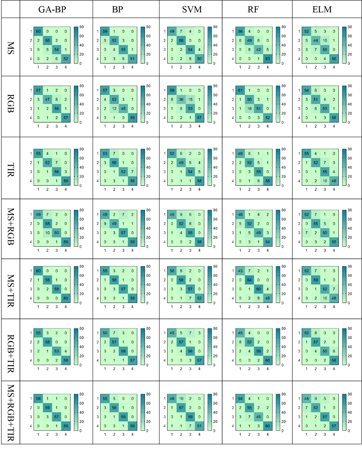 各种数据类型下各模式的混淆矩阵