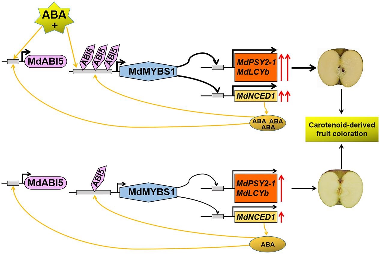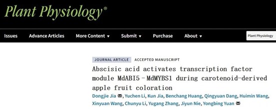 近日,太阳成集团tyc522cc原永兵/贾东杰教授团队在Plant Physiology上在线发表了题为“Abscisic acid activates transcription factor module MdABI5–MdMYBS1 during carotenoid-derived apple fruit coloration”的研究论文。该研究揭示了转录调控模块MdABI5-MdMYBS1响应ABA并调控苹果类胡萝卜素和ABA生物合成的分子机制。