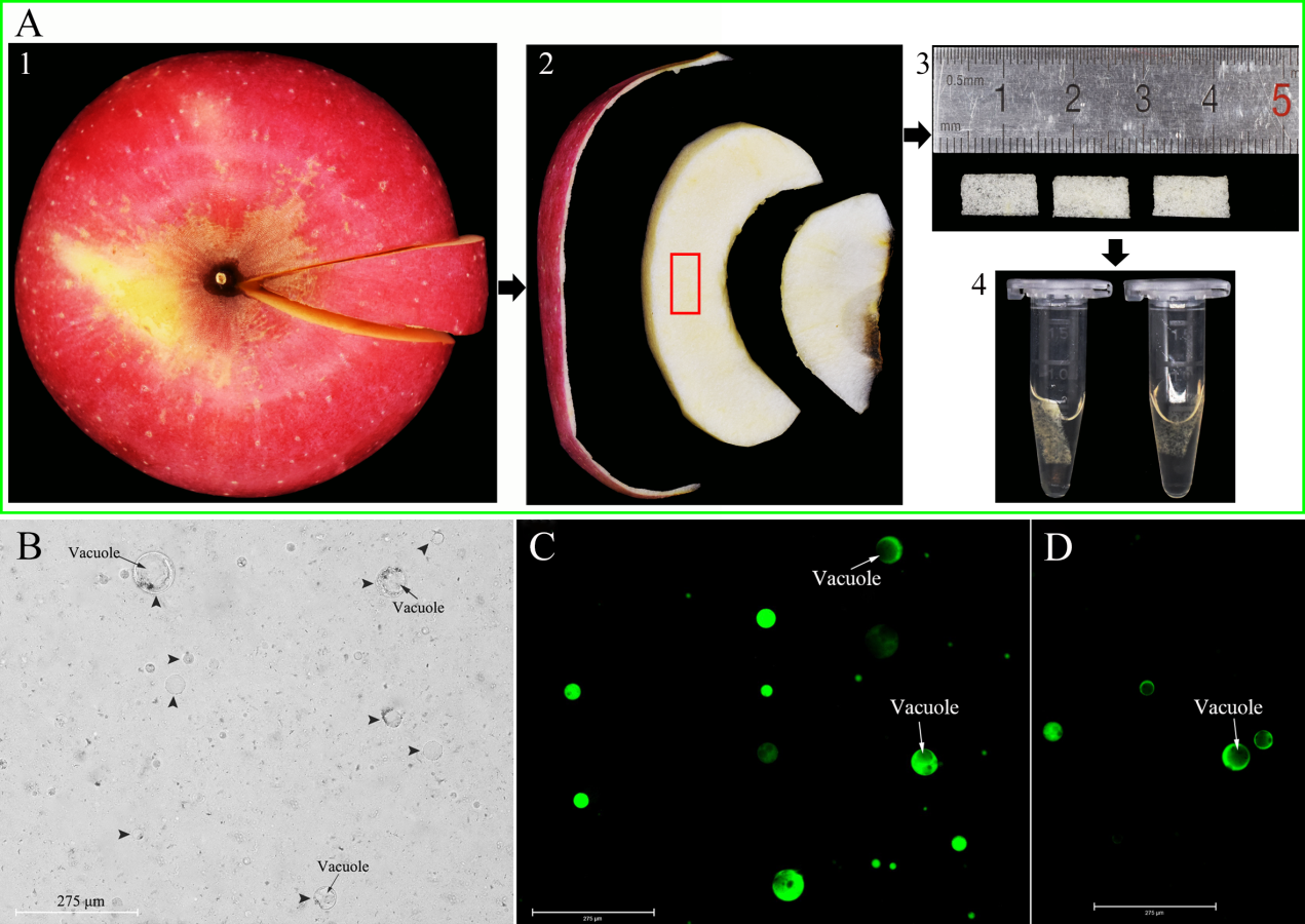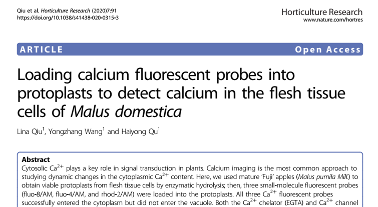 2020年6月,太阳成集团tyc522cc果树生理与栽培课题组在园艺领域顶级期刊Horticulture Research(一区)在线发表了题为“Loading calcium fluorescent probes into protoplasts to detect calcium in the flesh tissue cells of Malus domestica”的研究论文。该论文首次发现Fluo-8/AM等小分子荧光探针可以染色苹果果肉胞质中的Ca2+,可用于检测细胞质中Ca2+的时空变化。太阳成集团tyc522cc硕士研究生仇丽娜为本论文第一作者,太阳成集团tyc522cc王永章教授和屈海泳副教授为论文的共同通讯作者。该论文得到了国家重点研发计划项目(2016YFD0201120)的资助。