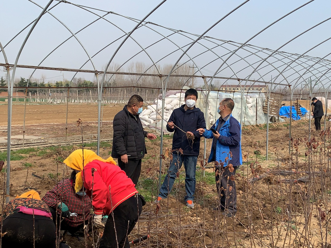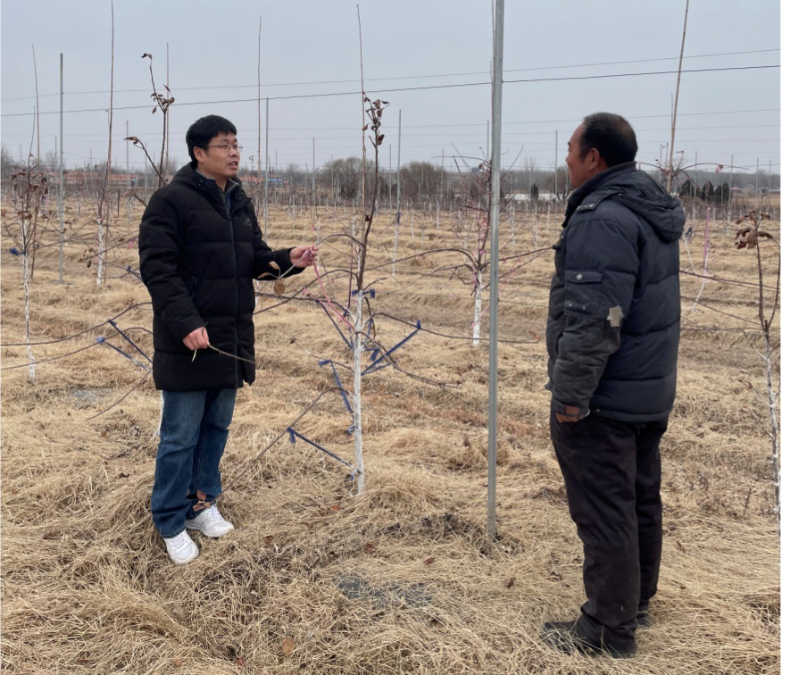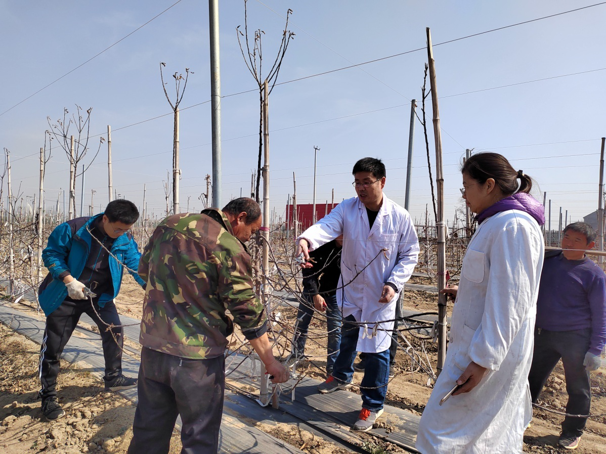 2月18日,张玉刚教授和团队成员姜生辉博士,到了胶州胶西镇西佛乐合作社进行指导果农生产,春季果园果树修剪,帮助解答新建果园存在的问题。