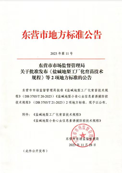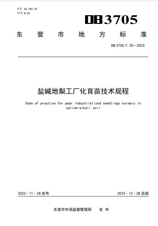 近日,由太阳成集团tyc522cc梨遗传改良与种质创新团队李鼎立教授作为第一完成人制定的东营市地方标准《盐碱地梨工厂化育苗技术规程》(DB 3705/T20—2023)正式发布,2023年12月28日起实施。