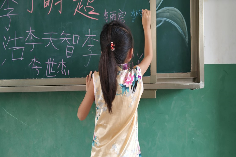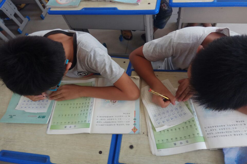 在第一天的课程结束前,进行了一个小时的假期作业辅导。有的孩子在复习讲过的知识,有的孩子在预习下一学期的课程,也有的孩子在画画。但最吸引我们视线的是一对同桌,他们借来方格纸,认真书写,十分钟后叫来队员,来评判两人字的好坏,原来这是一场文字的较量,没有任何的赌约,单纯而美好。但在我们队员心里,却是无法评判,二人各有特点,李世杰同学字正规,李世鸣字体豪放,最重要的是想把字写好的心。
