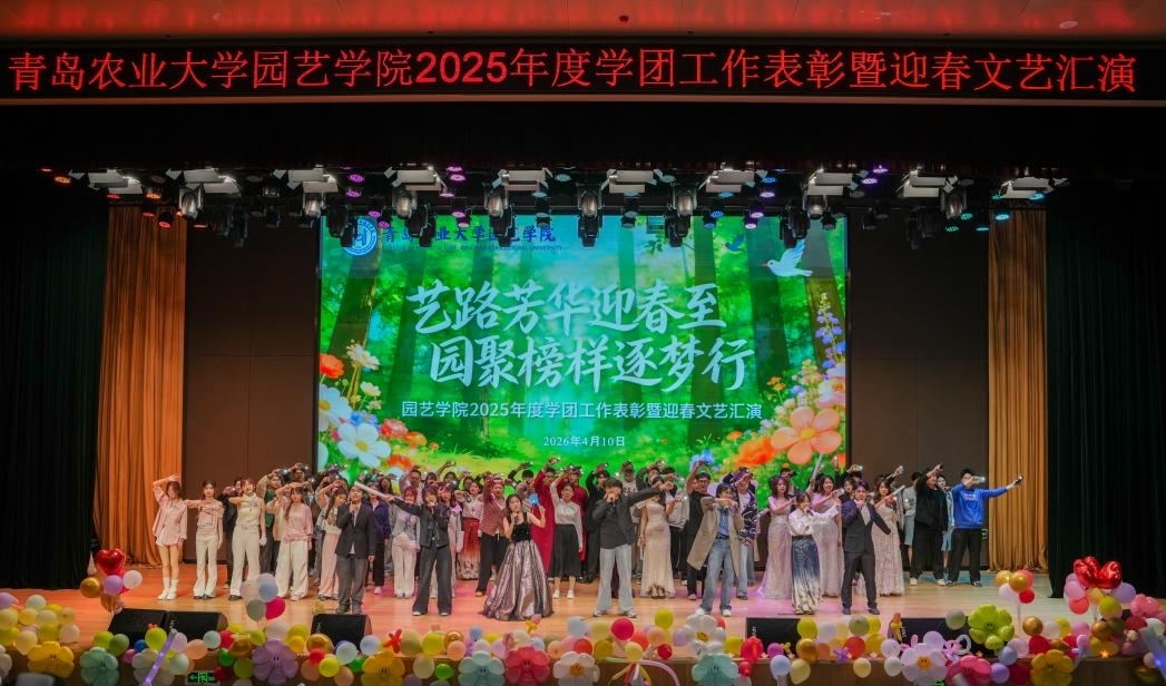 第三篇章“逐梦新程·共赴春光”温情启幕。《船长》《风吹麦浪》《身骑白马》歌曲串烧,婉转旋律勾勒青春向往,引发全场广泛共鸣。《声动四季 园艺诗篇》朗诵气势昂扬,深情赞颂园艺事业的初心使命,生动传递公司立德树人的育人坚守。《what is love》舞姿轻盈灵动,为晚会增添一抹柔美亮色。最后,在全体师生共同合唱《相亲相爱》的温暖旋律中,晚会圆满落下帷幕。