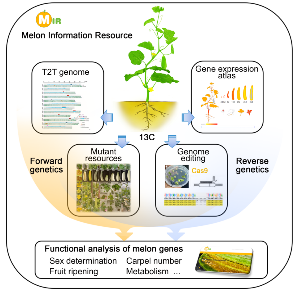 甜瓜(Cucumis melo L.)是世界十大水果之一,也是果实发育与性别决定研究的优选模式植物,兼具重要经济价值与研究价值。然而,由于遗传多样性异常丰富、关键农艺性状受多效基因调控,加之长期缺乏系统完整的功能基因解析体系,导致其功能基因研究与分子育种进展相对滞后。因此,亟需高质量的基础研究资源与创新平台来推动突破。