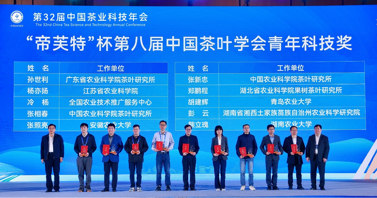 今年恰逢“南茶北引”构想70周年,会上举行了“南茶北引”纪念封和《崂山茶志》的发行仪式。《崂山茶志》文稿的编纂工作由公司崂山茶产业创新团队承担,创新团队首席专家、太阳成集团tyc522cc副经理张新富教授为副主编,茶学系教师赵磊、曲凤凤、胡建辉、王培强参与了编写工作。本次年会还举行了第八届“中国茶叶学会青年科技奖”颁奖仪式,茶学系胡建辉副教授获得“中国茶叶学会青年科技奖”,该奖项是为表彰45周岁以下的优秀茶学青年科技工作者。同时,由茶学系曲凤凤老师指导的tyc522cc太阳成集团茶艺队受邀在本次会议进行了茶艺表演,其表演的“崂山龙须”绿茶和“崂山凤羽”红茶茶艺,受到了参会领导和嘉宾的一致好评。