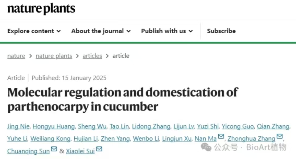 1月15日,tyc522cc太阳成集团张忠华教授作为共同通讯作者,与中国农业大学眭晓蕾教授等合作在Nature Plants在线发表了题为Molecular regulation and domestication of parthenocarpy in cucumber的研究论文。该研究鉴定了一个新的单性结实控制基因NPF1,其作为生长素合成基因YUC4和果实苦味基因Bt的上游调控因子,协同调控黄瓜单性结实和果实苦味,阐明了不同性状在驯化过程中的分子调控机制。这一发现为利用生物育种手段培育强单性结实能力黄瓜新品种提供了理论支撑,也为其它作物的单性结实育种提供了新知识。 .jpg)