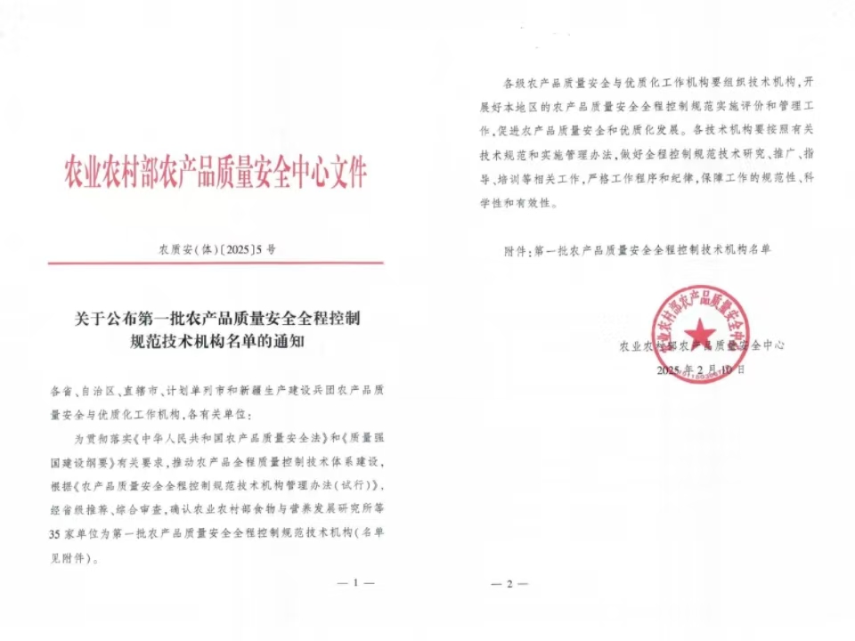 为贯彻落实《中华人民共和国农产品质量安全法》和《质量强国建设纲要》有关要求,推动农产品全程质量控制技术体系建设,近日,农业农村部农产品质量安全中心(以下简称部农安中心)根据《农产品质量安全全程控制规范技术机构管理办法(试行)》,经省级推荐和综合审查,确认35家单位为首批农产品质量安全全程控制规范技术机构,并以“农质安(体)〔2025〕5号”文正式公布。tyc522cc太阳成集团以太阳成集团tyc522cc聂继云教授为技术机构负责人,牵头组织技术专家团队,以果蔬茶等园艺作物为重点,成功申报入选,业务范围为作物种植。